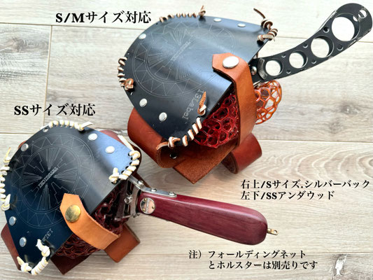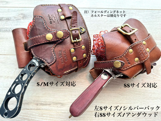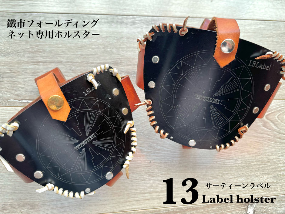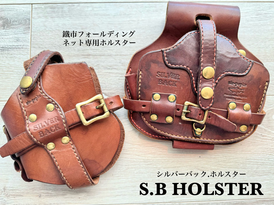 アルミ材を前面に配置した、鐵市フォールディングネット専用ホルスター。横から背面にかけて厚い牛ヌメ革をサドルオイルで仕上げたワイルドでお洒落なホルスターです。